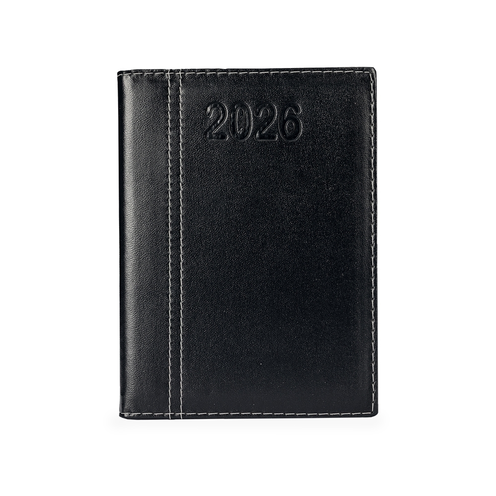 Agenda diária 2026 com capa em couro sintético e marca-páginas em fita de cetim. Possui páginas dedicadas a dados pessoais, calendários de 2025 a 2027, lista de contatos, planejamento diário e mapas.