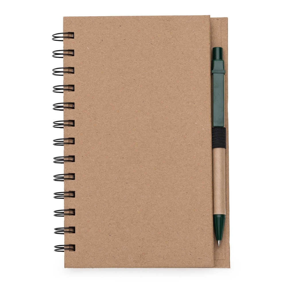 Caderneta ecológica com caneta e autoadesivos. Com dois suporte internos para cartão, possui cinco blocos autoadesivos com 20 folhas cada, bloco laranja e bloco amarelo com aproximadamente 20 folhas cada. Possui aproximadamente 70 folhas brancas pautadas e caneta de papelão de clip e ponteira plástica.